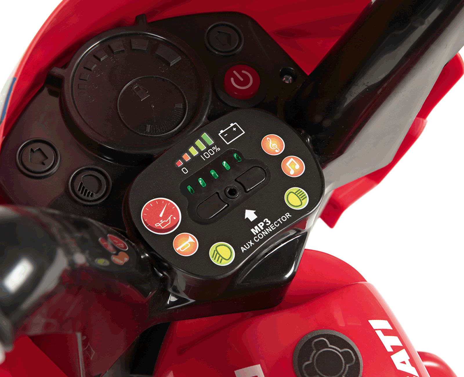 Porniti tabloul de bord electric folosind butonul START sau apasand pedala de acceleratie si veti fi uimiți! In plus fata de aprinderea luminii cu LED-uri de pe lampa din fata, copilul dvs. va putea sa auda si sunetul motorului, sa actioneze claxonul si sa asculte melodii preinregistrate. Mai mult, copilul dvs. poate asculta muzica preferata printr-un port pentru playere MP3 (neincluse).